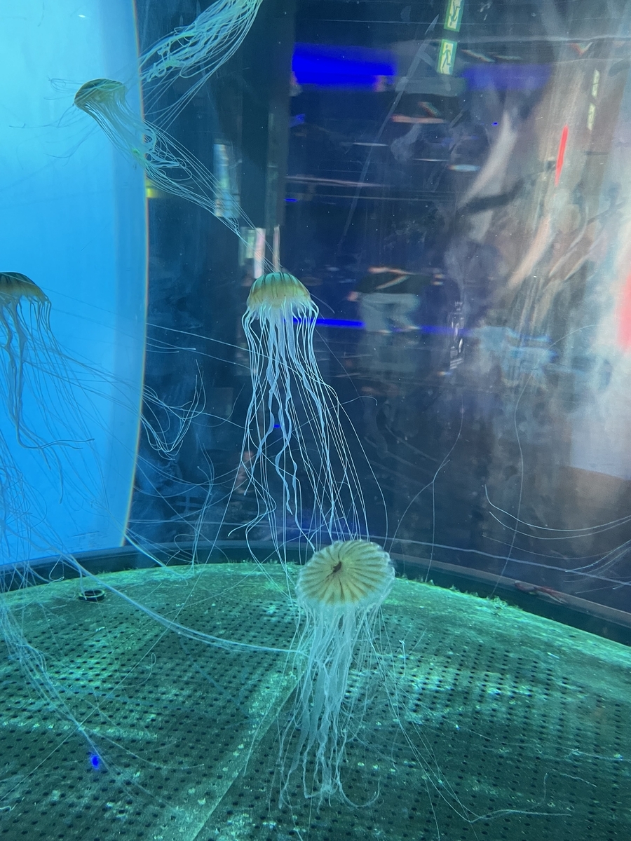 淡水魚の水槽がたくさんあるエリアです。落ち着きを取り戻して「魚さんいっぱいいるね〜」と言っていました。ここまで抱っこして背中トントンしていたため、写真はありません。残念。